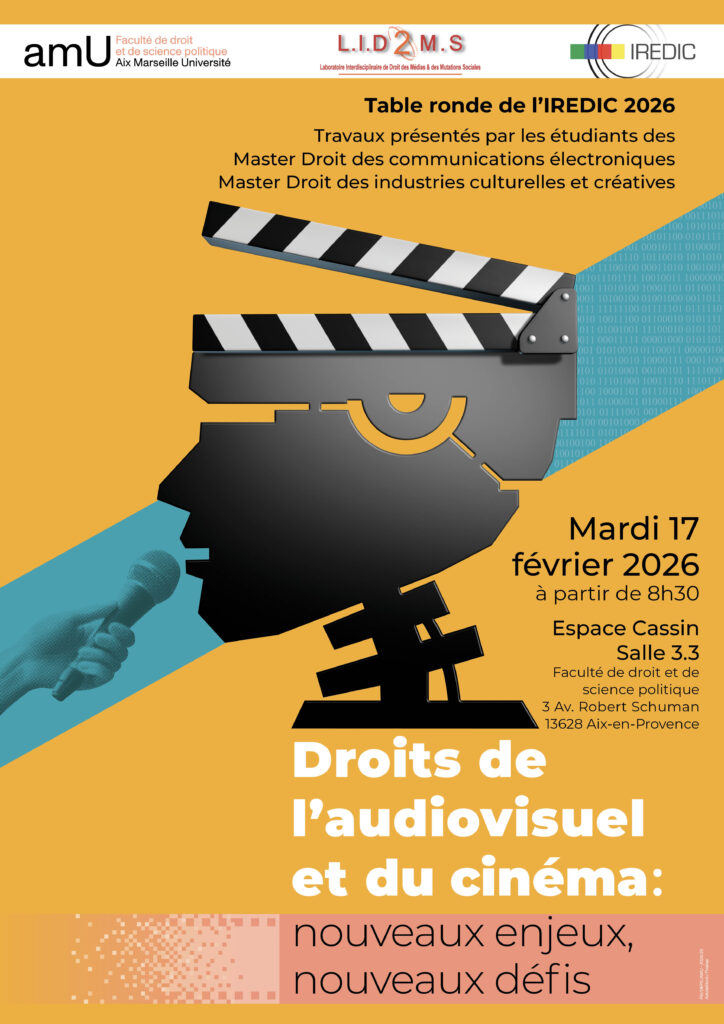 Tels sont les sujets auxquels les étudiantes et les étudiants des Masters 2 Droit des industries culturelles et créatives et Droit des communications électroniques vont se consacrer le 17 février 2026, à l’occasion de la table ronde annuelle de l’IREDIC. Les présentations se dérouleront dans la salle 3.3 du bâtiment René Cassin de la Faculté de droit ; le programme est consultable ci-après.